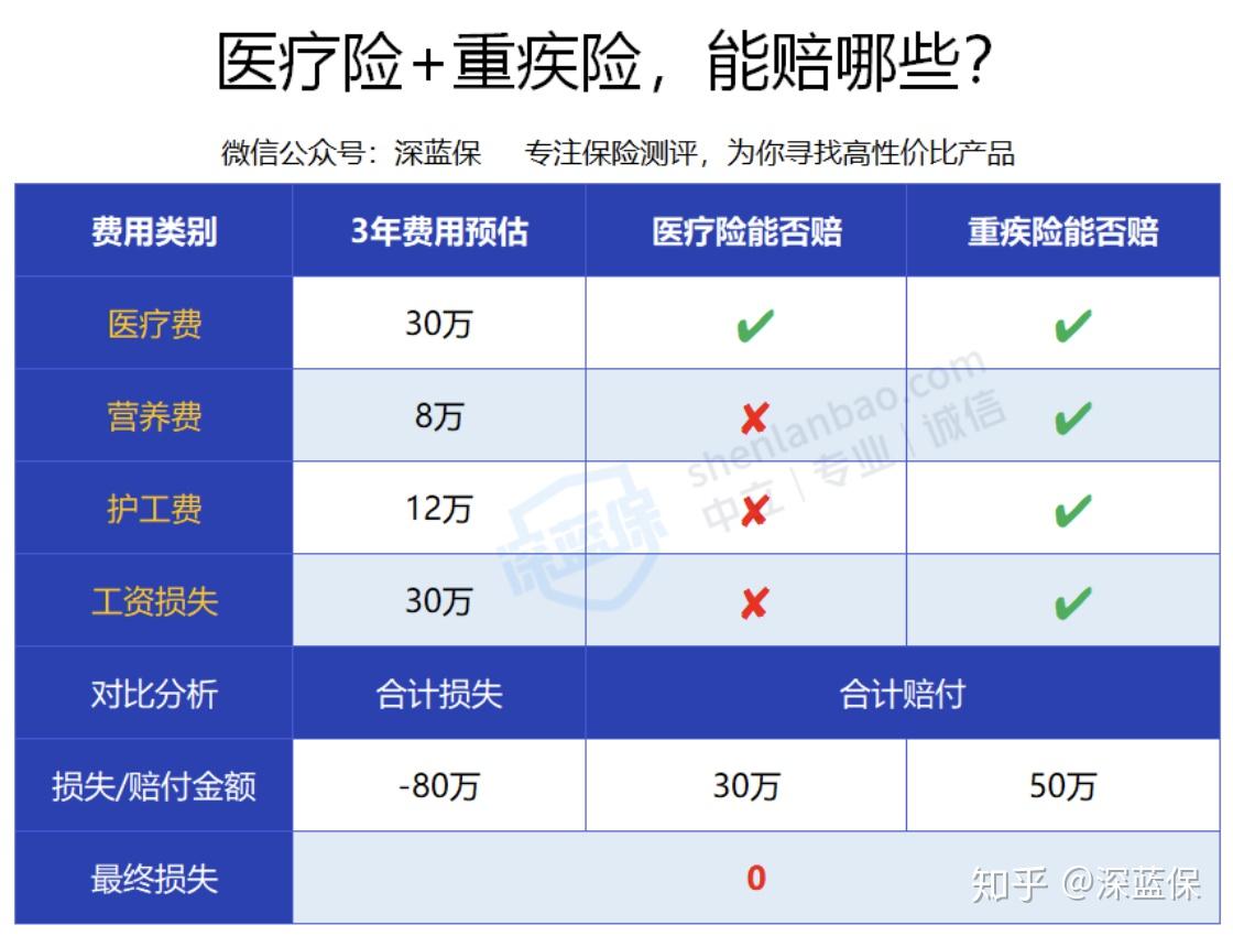 医疗险能报销 20 万的治疗费,而重疾险能一次性获赔 50 万,这笔钱随便怎么花。
