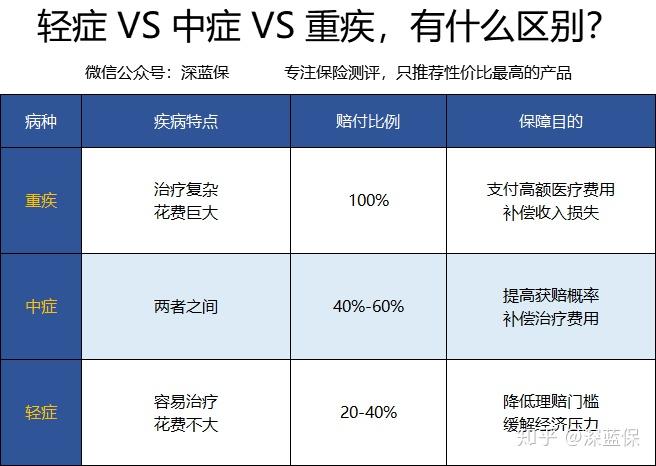 轻症和中症,本质上就是早期的重大疾病。在还没有发展成重疾以前,保险公司也会按一定比例理赔,比如轻症赔付保额的 20% - 40%,中症赔付 40% - 60%。