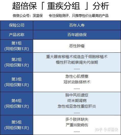 那什么叫做疾病分组呢?以刚刚方案一中的 百年超倍保 为例,它将 100 种重疾分为 5 组: