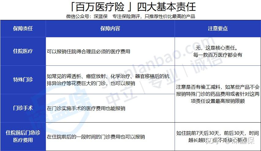 百万医疗险作为一款住院才报销的医疗险,其保障责任基本有四部分: