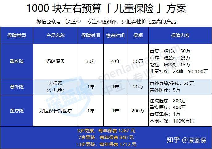 虽然为人父母都想把最好的给自家孩子,但对于很多普通工薪家庭来说,如果给大人配置完保险后,就没有太多预算,那深蓝君建议可以参考下面这套1000 块左右预算的方案,相信大多数家庭都能承受,而且也能给孩子不错的保障。