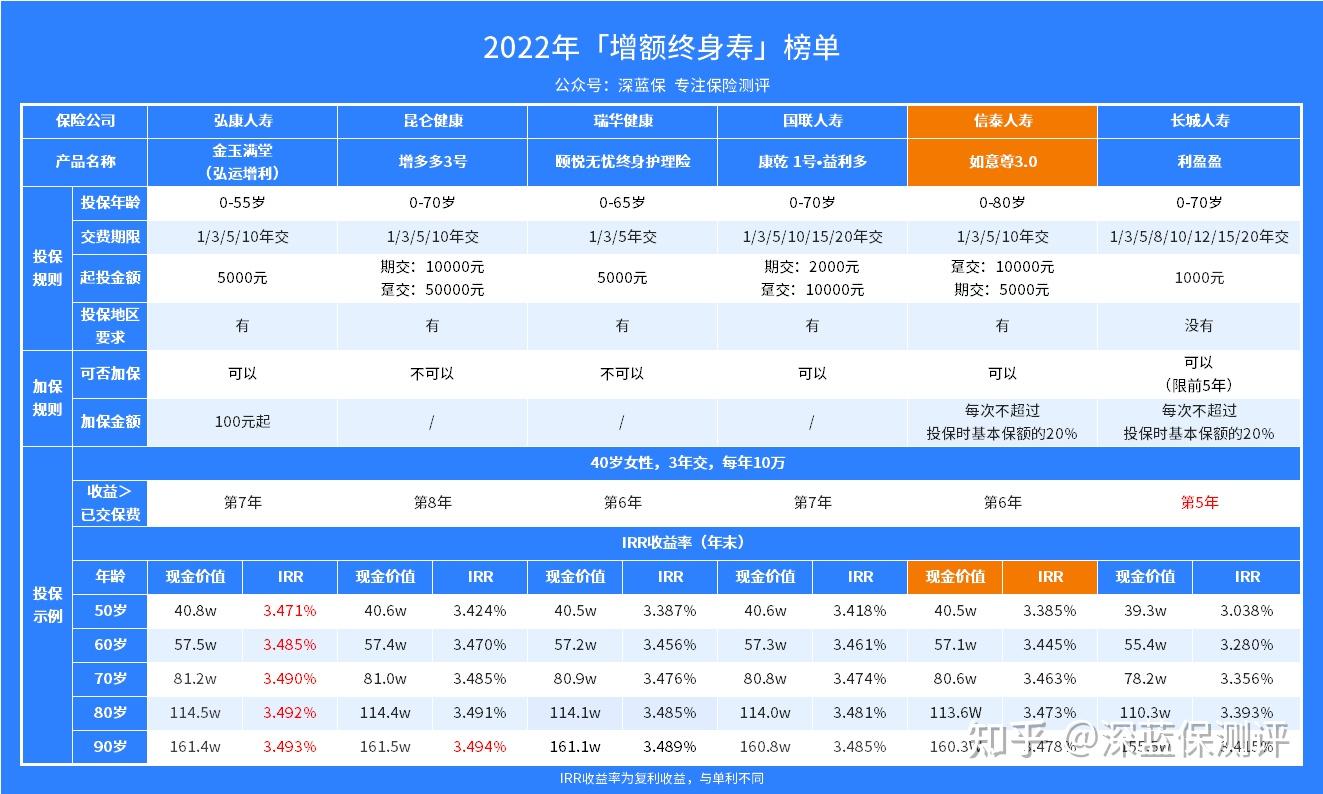 深蓝君以40岁女性、3年交、每年10万为例,把信泰如意尊3.0终身寿险,和2022年比较热门的其它增额终身寿险对比一下,看看整体表现怎样。
