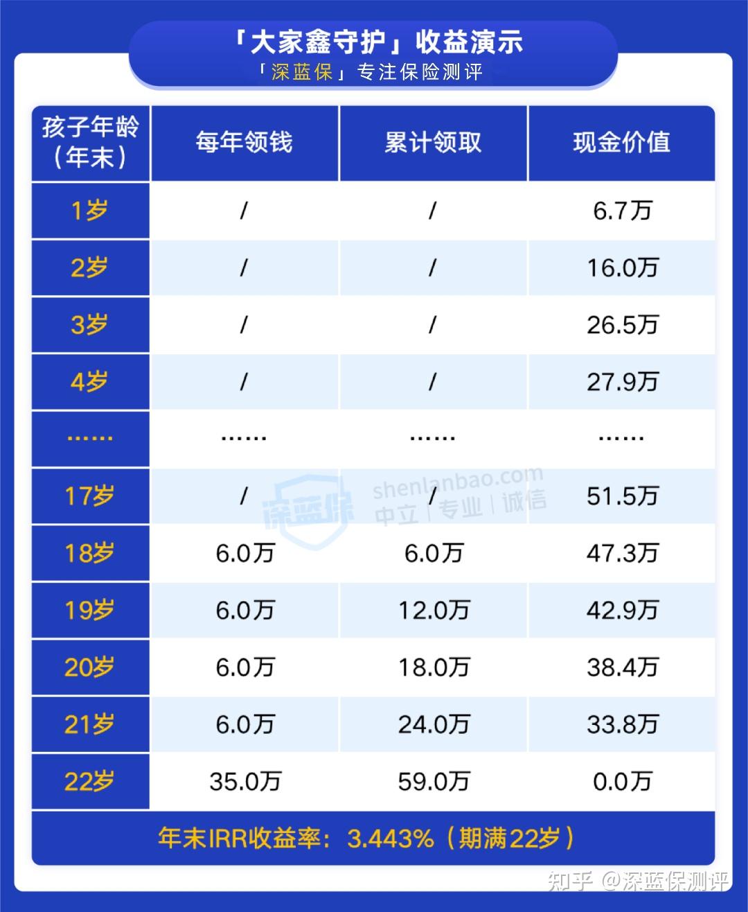 到孩子 22 岁大学毕业,合同期满能一次取出差不多 35 万,可以给孩子进入社会做准备。