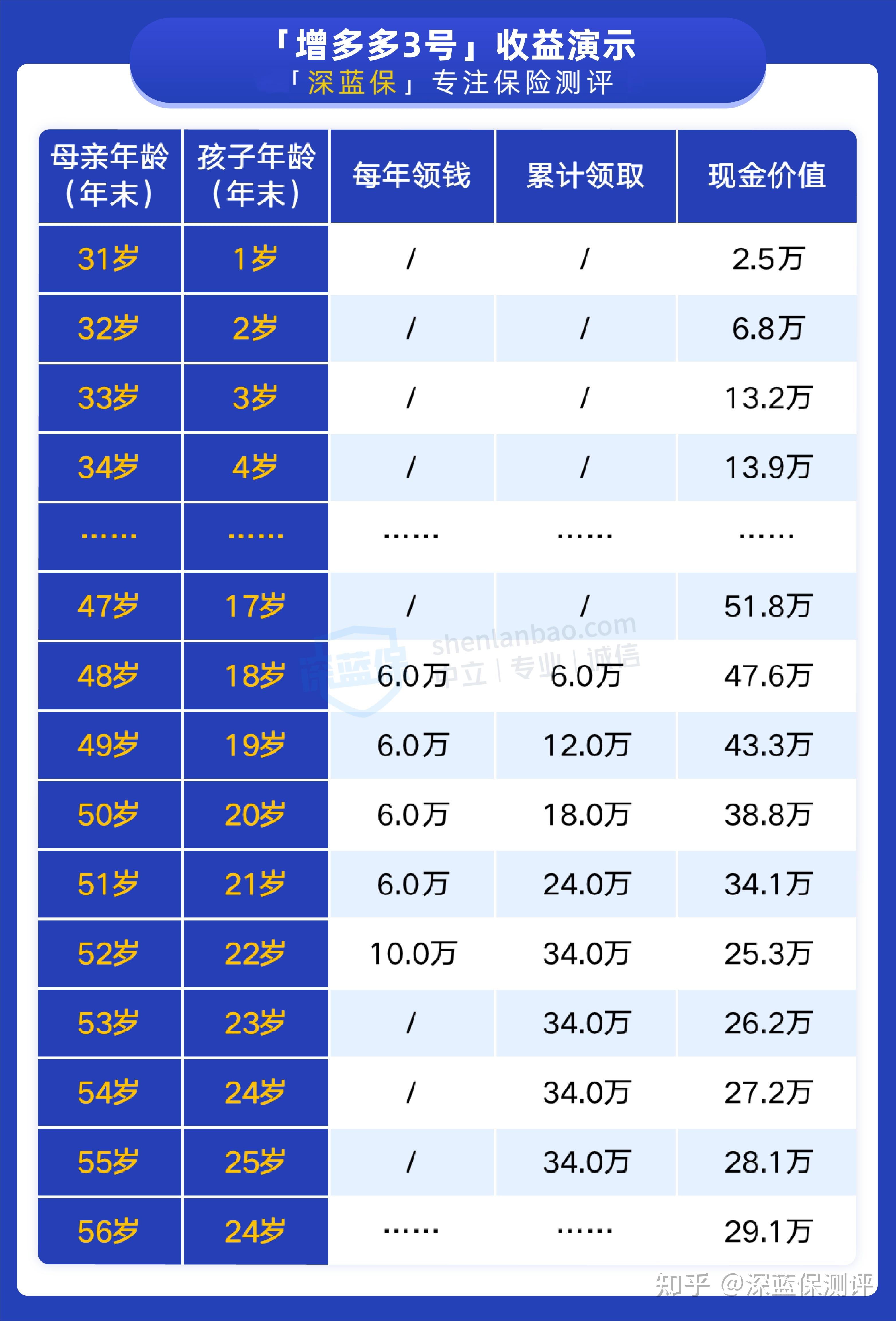 更直观的来说,正如上面的例子,每年交10万,交3年,共交了30万后,最终领取 59 万多,几乎是已交保费的 2 倍。