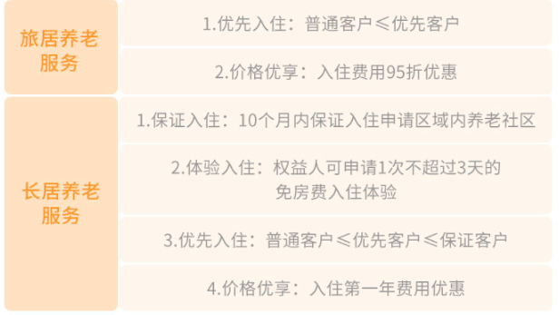 当然,不同保费的用户,在养老社区的权益也不同,主要分为旅居养老服务和长居养老服务。