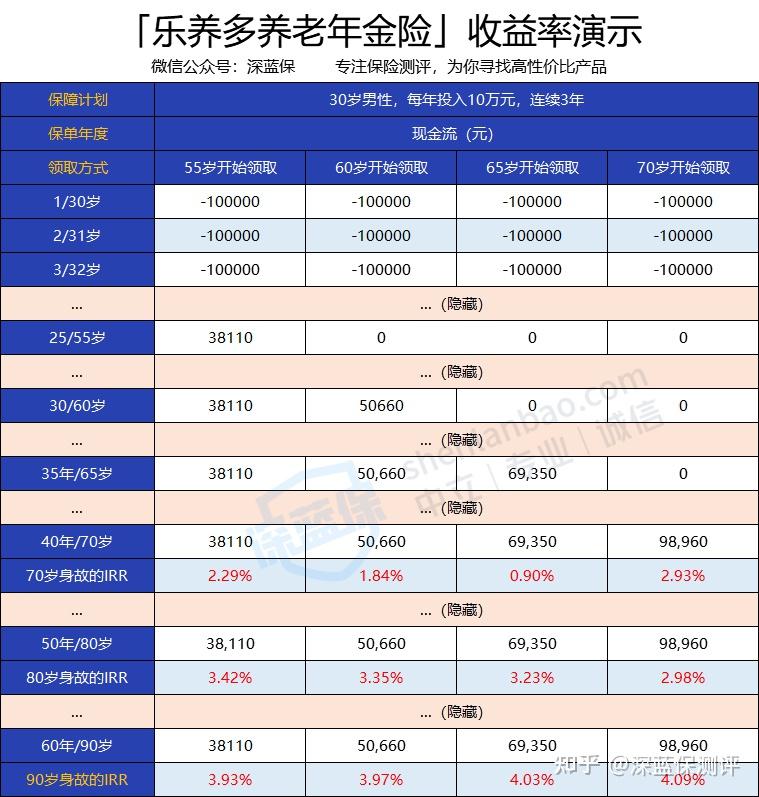 可以看到,在长寿的情况下,收益率都比较高;因为没有规定的保证领取期间,身故就领不到钱,所以在早逝的情况下,收益率都比较低。