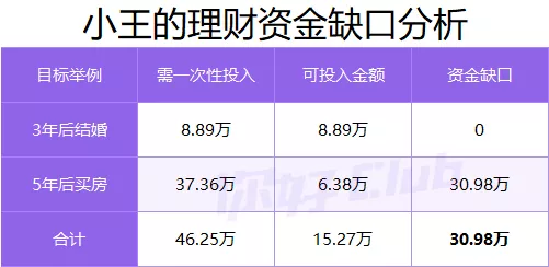 小王原来有 20 万,预留生活费和保费之后,只剩下 15.27 万,只能满足结婚的目标,买房还需要投入 30.98 万。