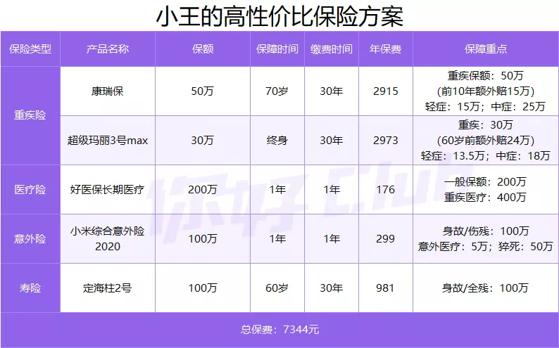 我们通过筛选市面上的高性价比保险,为小王配齐了四大保障型保险: