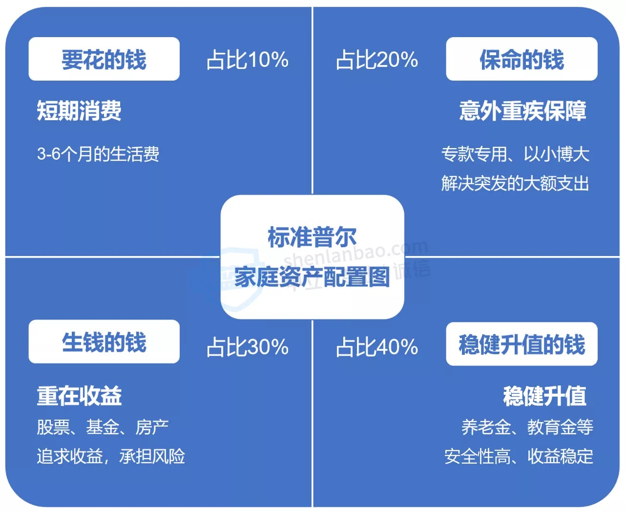 “保命的钱”(20%):这部分钱相当于人生的安全垫。一部分可以用来买四大险种,用确定的小笔开销应对人生未知的风险,如:意外、疾病、死亡;一部分用来应急,应对家庭发生突发情况。