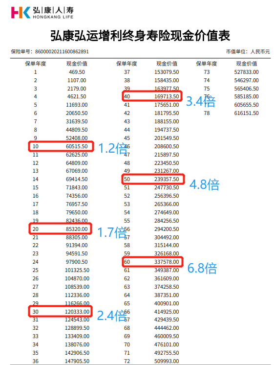 不过,虽然平型关保单现金价值超过已支付保费最快,但与弘运增利的现价差距还是蛮大的,到80岁,足足相差4.2万。