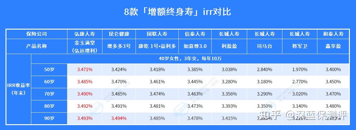 从图中可以看到金玉满堂这款产品在50、60、70、80岁的时候的IRR收益率在几款产品中都是最高的,即便90岁的收益率也与第一名的增多多3号相差无几。