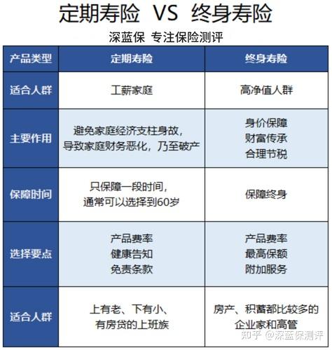 根据保障时间的不同,寿险可以分为定期寿险和终身寿险。深蓝君做了一张图,大家可以直接看到两者的差异: