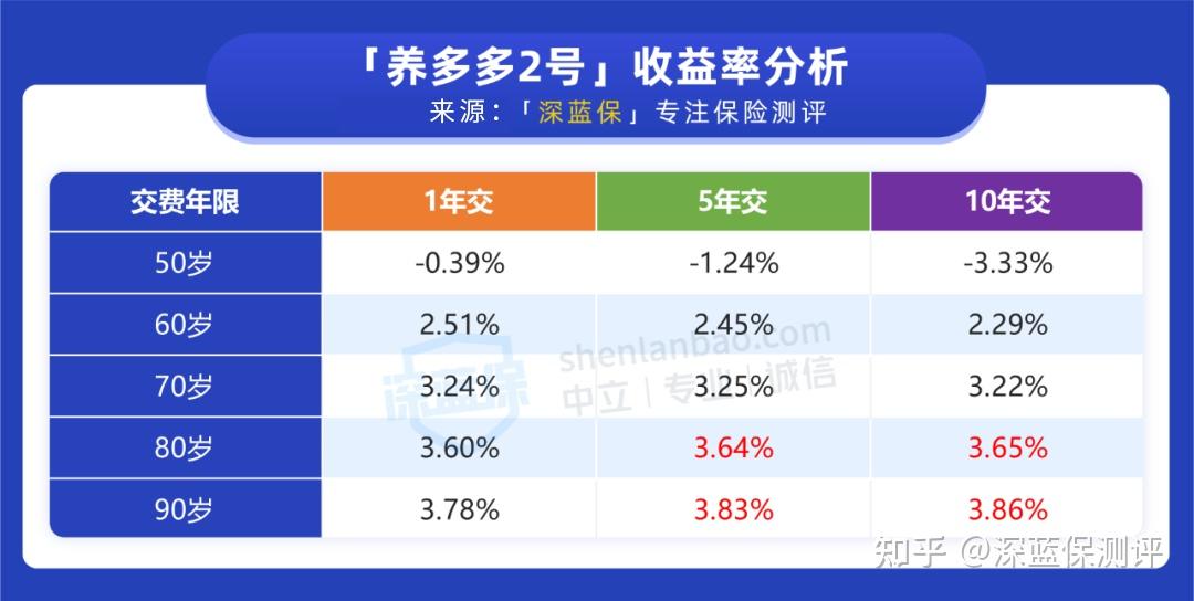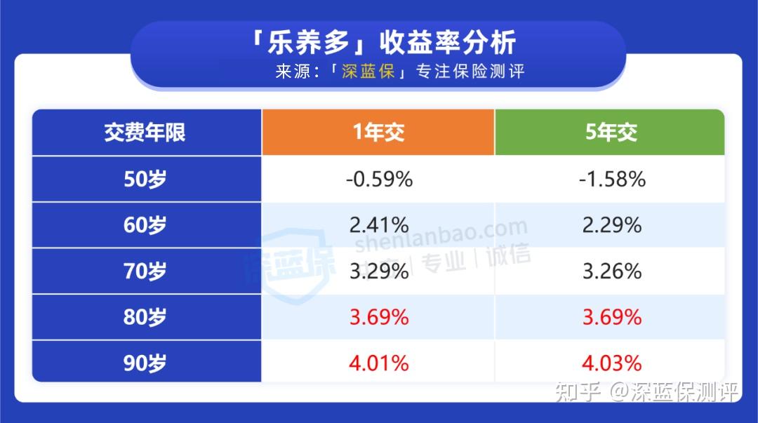许多产品在七八十岁就没有现价了,而它到 105 岁前都有,看重收益的朋友,可以优先考虑乐养多,性价比会高一些。