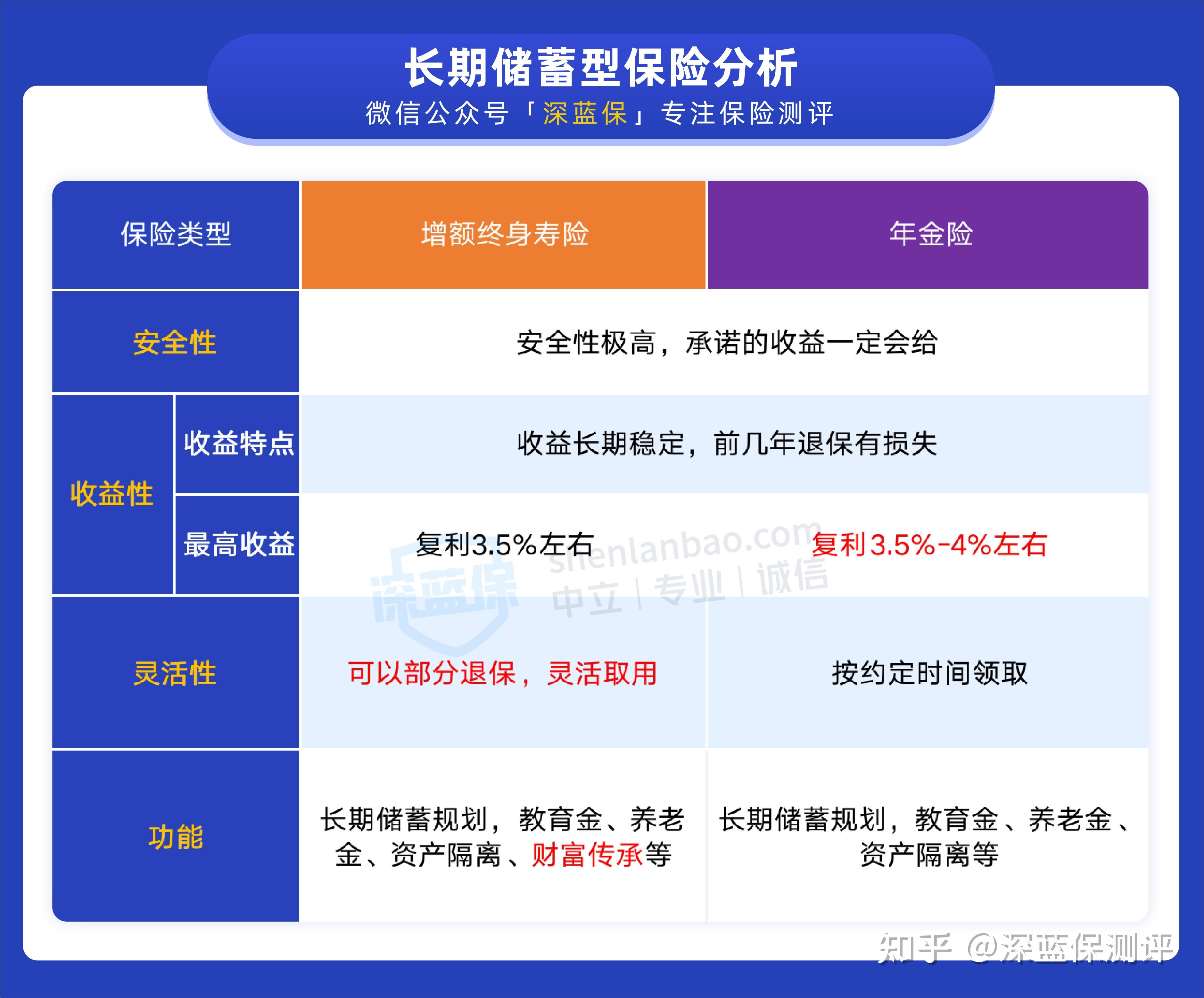 而针对这些需求的话,其实例如年金险、增额终身寿这样的产品还是相对挺合适的,让我们来对比着看看这两类产品的一些特点分析。