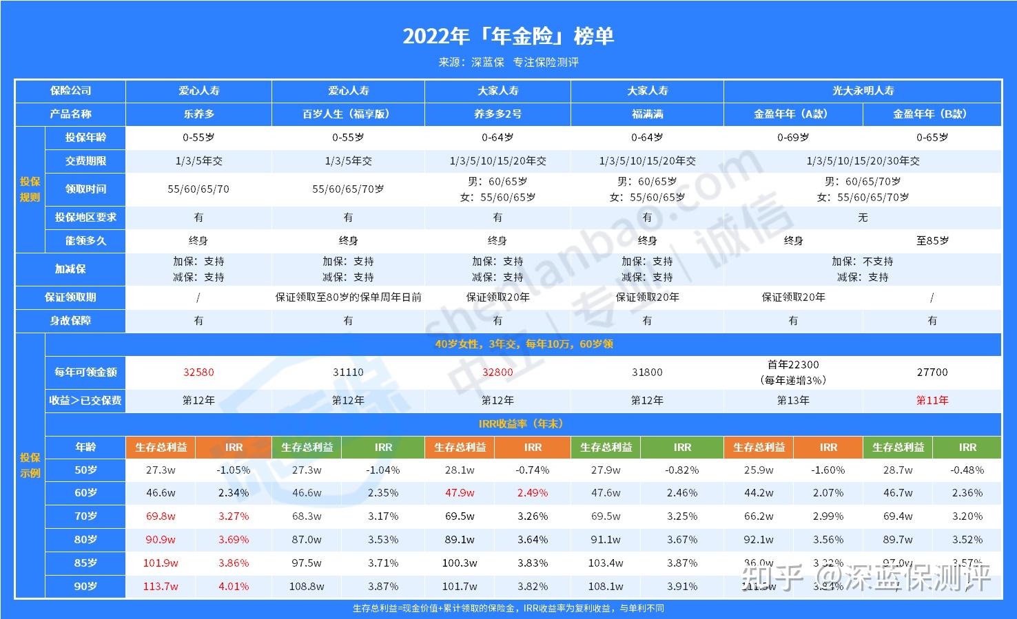 深蓝君从中挑选了五款2022最火的年金险产品供大家参考,以"40岁女性,3年交,每年10万60岁领“为例: