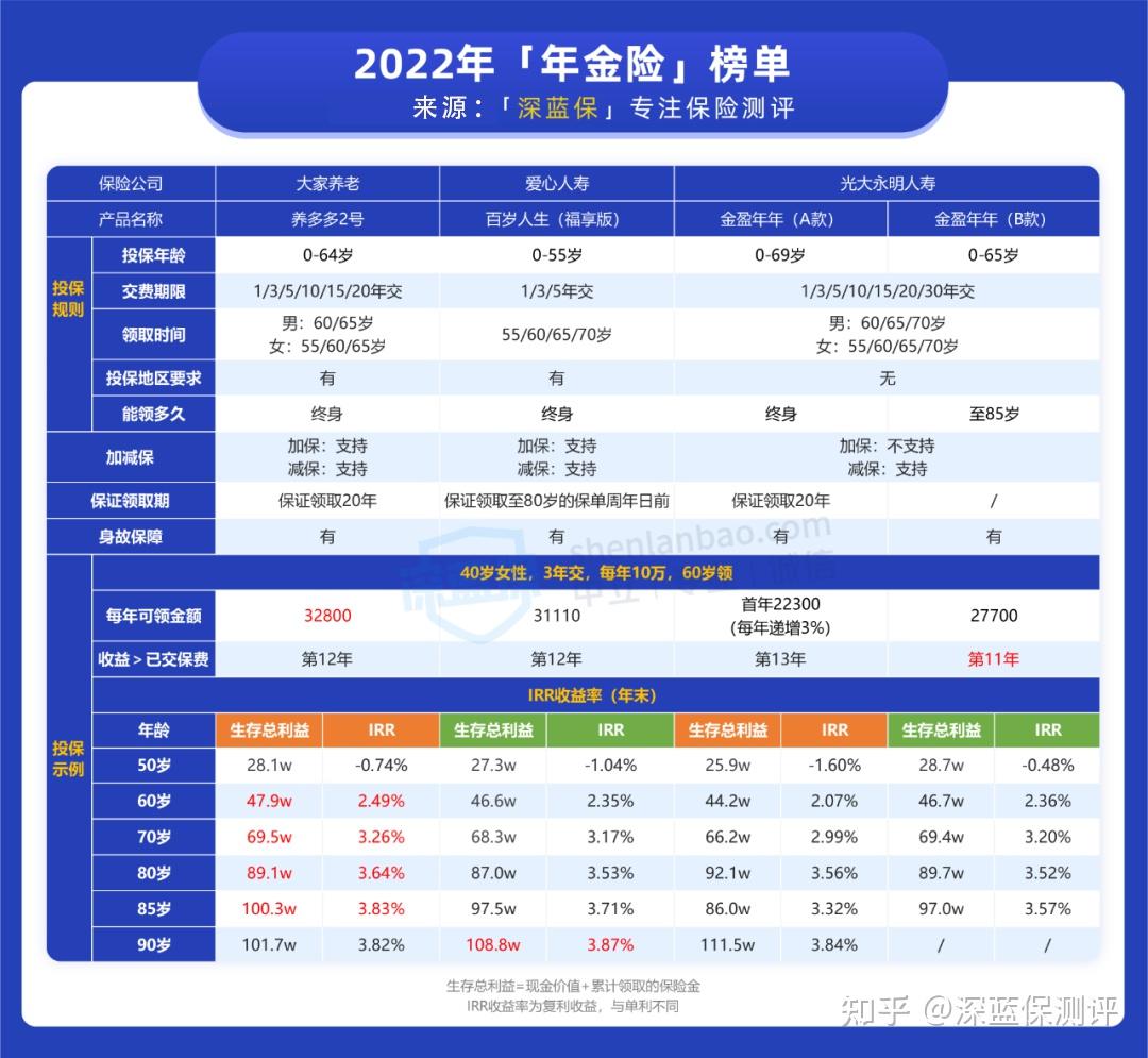 我们筛选了3款目前表现不错的年金险产品,以“40岁女性,分3年交,每年交10万,60岁开始领取”为例子来分析一下: