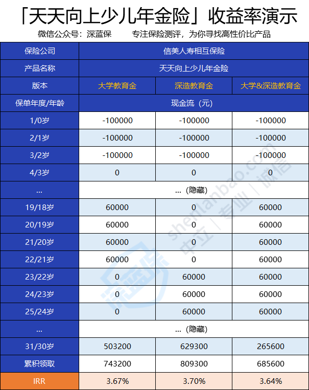 可以看到,无论是选择哪个版本,收益都差不多。其中,深造教育金版本的收益最高,为3.70%;大学&深造教育金版本的收益最低,为3.64%。