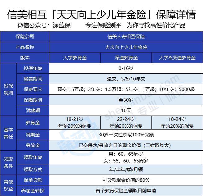 信美相互的天天向上少儿年金险,共分了3个版本:大学教育金、深造教育金、大学&深造教育金,0-16岁的少儿都能投保,可保障至30岁。它最长可选10年缴费,最低5000元即可投保。