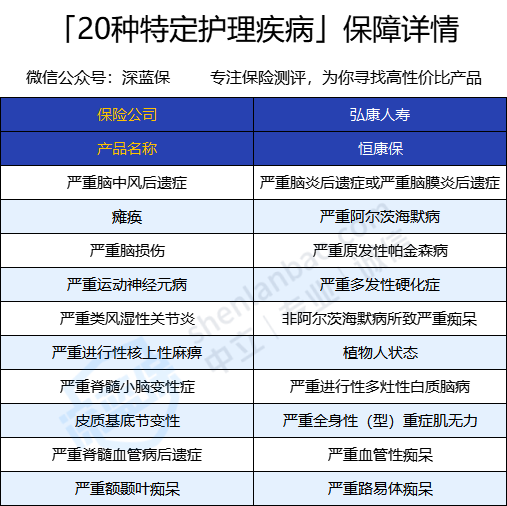 而弘康恒康保却很贴心,针对20种特定护理疾病,也能赔付一定的保险金。