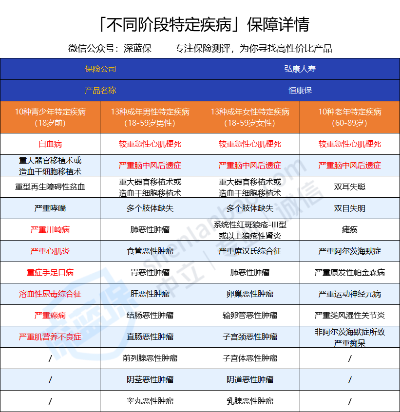弘康恒康保的这项责任,对不同年龄段常见的高发疾病,提供了额外保障。