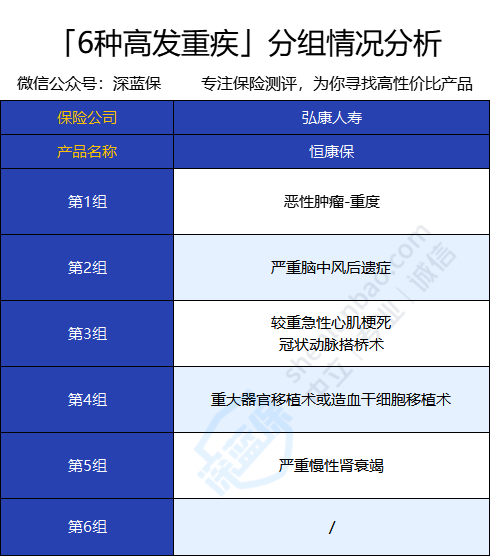 弘康恒康保,重疾最多可赔付6次,间隔期180天,且6大高发重疾分成了5组,优于市场标准。