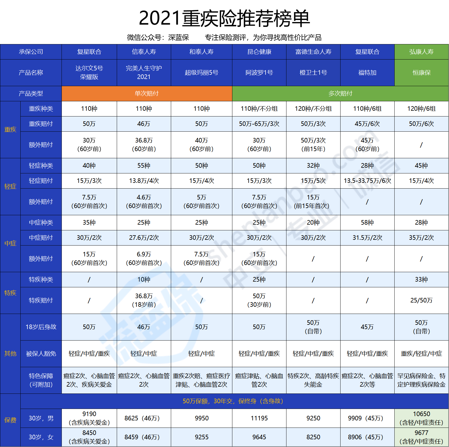 - 如果追求重疾保障:可以考虑超级玛丽5号和福特加。超级玛丽5号首创重疾责任复原金,同种重疾可以重复赔;福特加重疾最多可赔6次,且重疾保额可依赔付次数递增,最高赔250%保额。