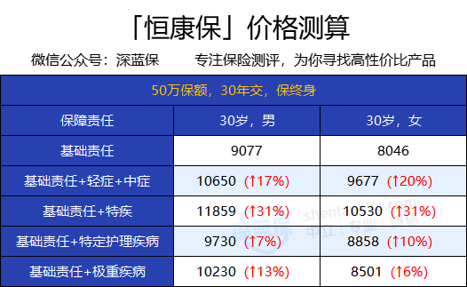 可以看到,如果附加了轻/中症、特定护理疾病或极重疾病保障,保费的涨幅都还在正常范围内;如果附加了特疾保障,保费涨幅超出了30%,还是有些高的。
