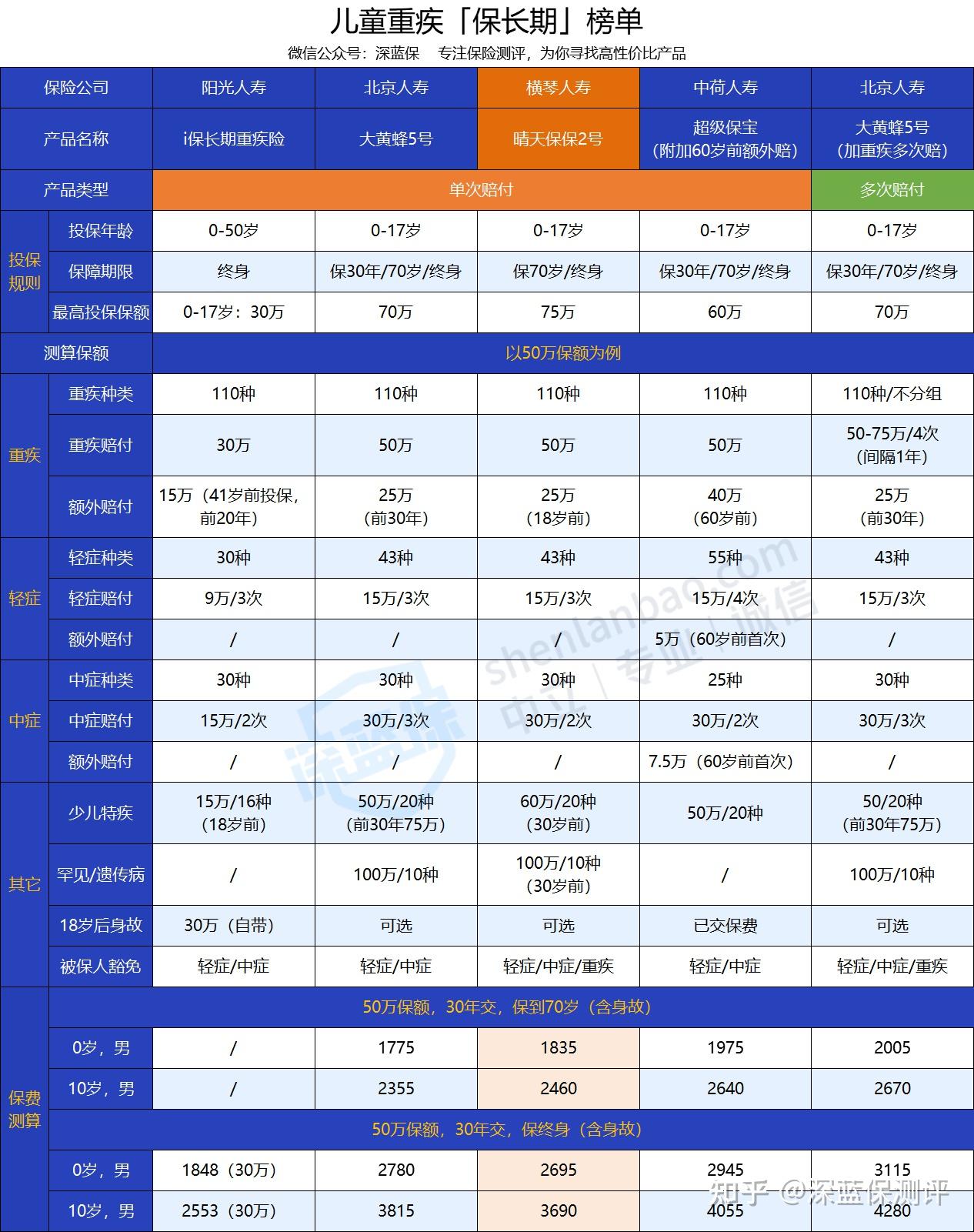 深蓝君挑选了市面热销的儿童重疾险来对比看看: