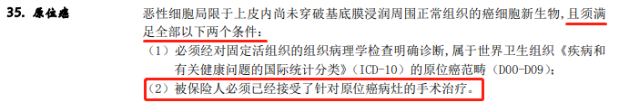 其要求被保人要做了手术后才能理赔,但很多重疾险产品只写了“接受了针对原位癌病灶的积极治疗”,如完美人生守护2021、阿童沐1号。