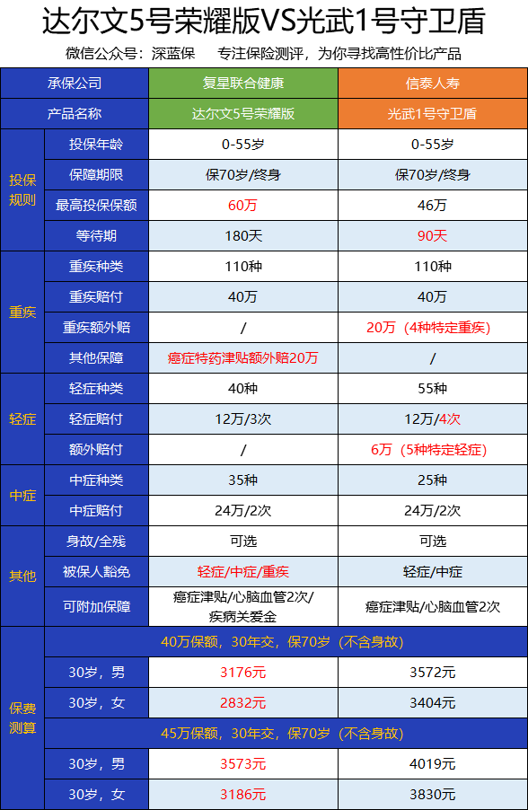 这就让深蓝君想起了达尔文5号荣耀版,同为性价比不错的重疾险产品,到底谁性价比更高?