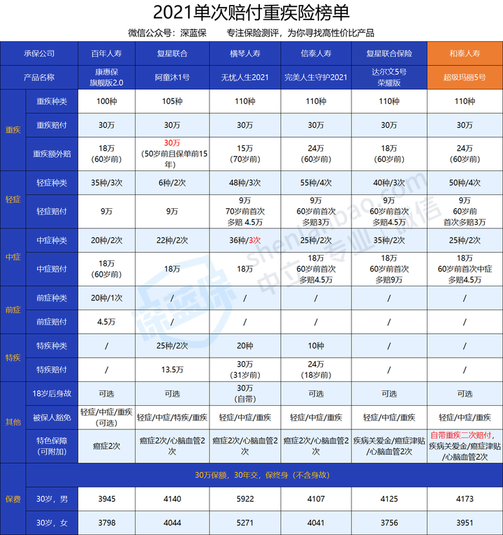 - 如果追求性价比:首选完美人生守护2021,60岁前首次重疾多赔80%保额,同价位中性价比最高。也可以考虑达尔文5号荣耀版。