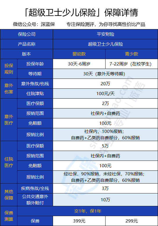 相比之下,超级卫士少儿保险,整体保障比较均衡,医药费的报销条件也很不错,乙类药的自费部分及自费药都能报销,价格虽然稍高一点点,但和保障相匹配。