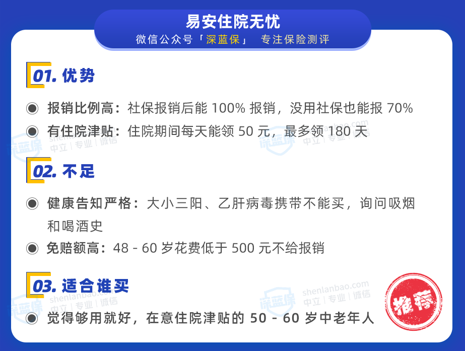 50 - 60 岁的中老年人,可以考虑易安住院无忧,它的优势和不足供大家参考:
