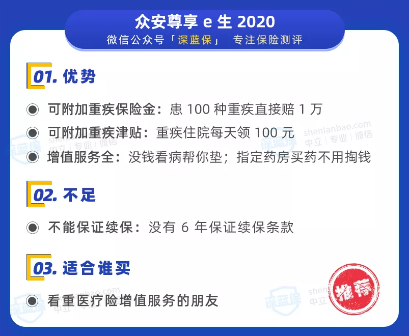 众安还有一款尊享 e 生 2020 门急诊版,价格贵了几十块钱,想要门急诊保障的朋友可以考虑一下(点击查看)。