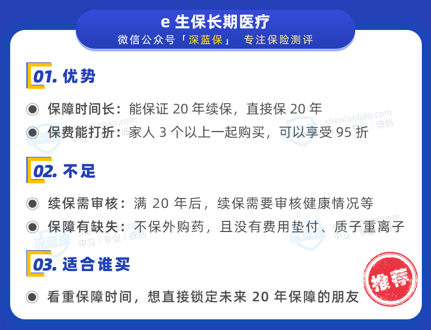 e生保长期医疗直接保障未来 20 年,是目前市场上保最久的医疗险,它的优缺点如下: