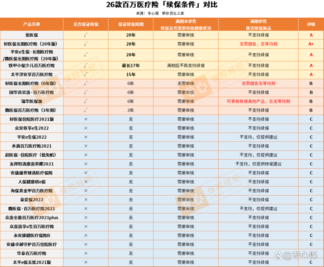 通过第一轮的筛选,30款产品还剩26款。下面是26款产品的续保条件对比: