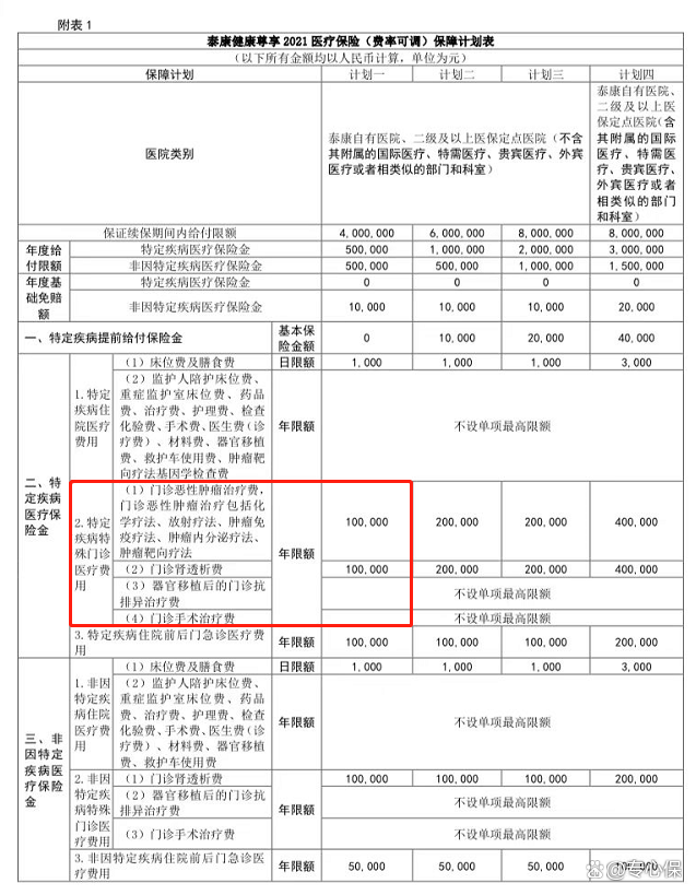 比如新华康健华尊,不含门诊手术。再比如泰康尊享2021,计划一总保额50万,但癌症治疗限额只有10万。