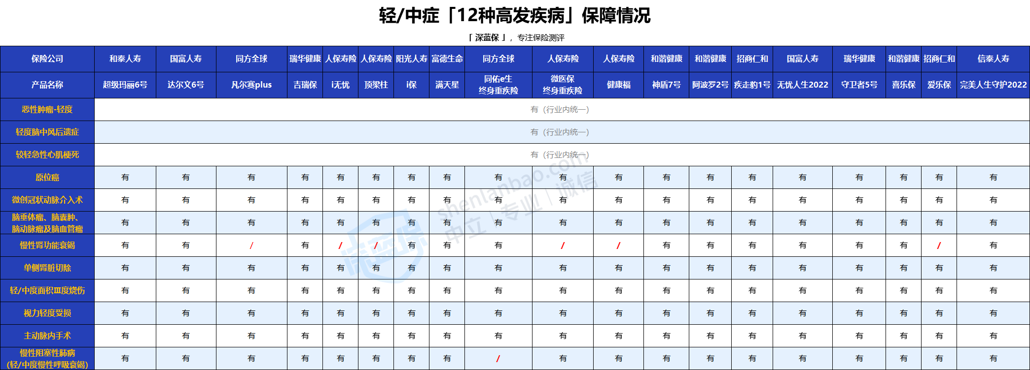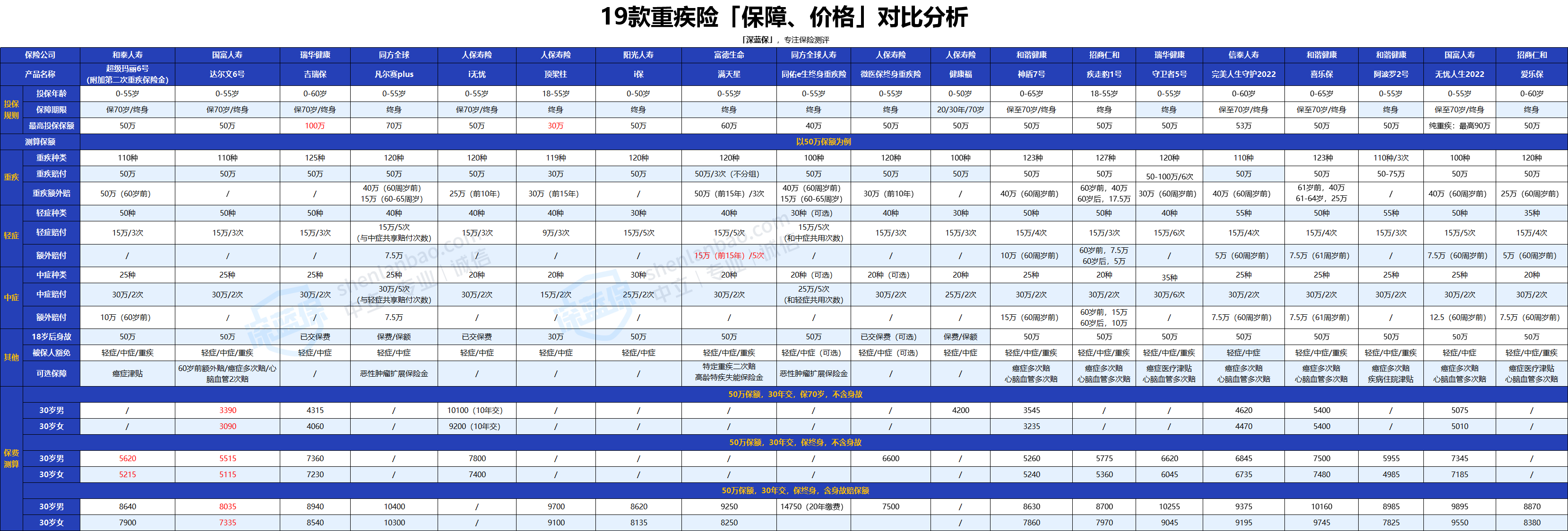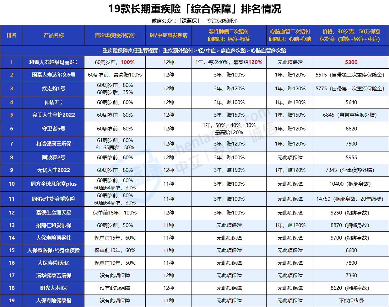 我们先看表头,左边第一列为测评维度,主要围绕重疾保障、轻症保障、中症保障、其它保障、价格五个方面展开。