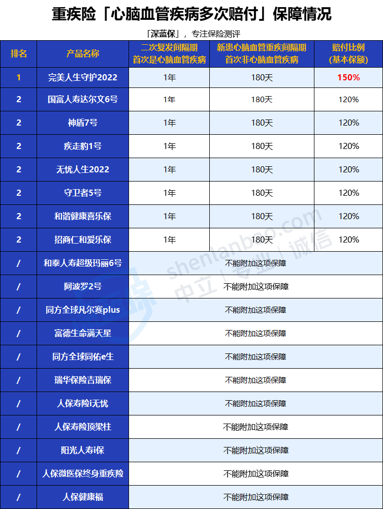 其中完美人生守护2022占据明显优势,间隔期是最宽松的一类,赔付比例也是最高的,能赔到150%,甩其它产品一条街。