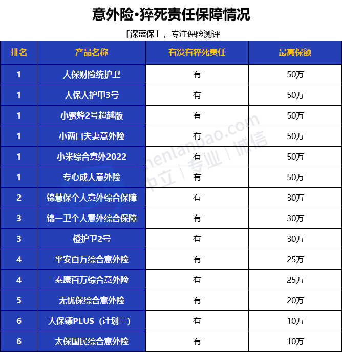 共有 14 款产品上榜,其中并列第一的 6 款产品表现不错,猝死保额最高都能赔付 50 万。