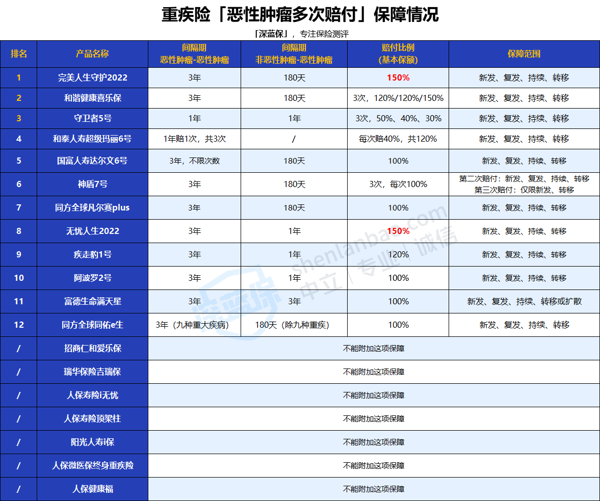 关于癌症多次赔付,19款产品中,排名前3的是:完美人生守护2022、和谐健康喜乐保、守卫者5号。