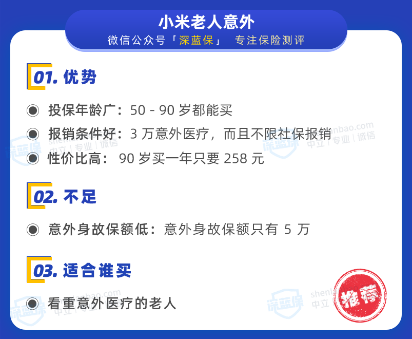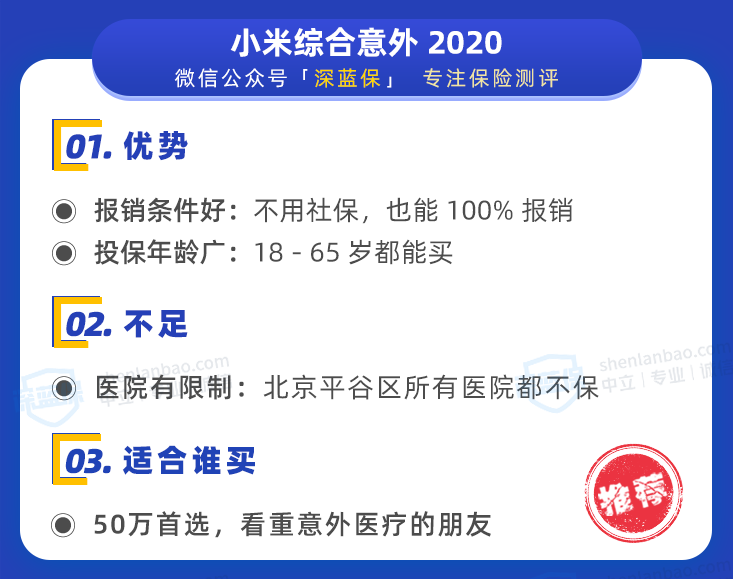 小米综合意外 2020同样是非常不错的产品,最大的特点是医疗报销条件好,它的优缺点总结如下: