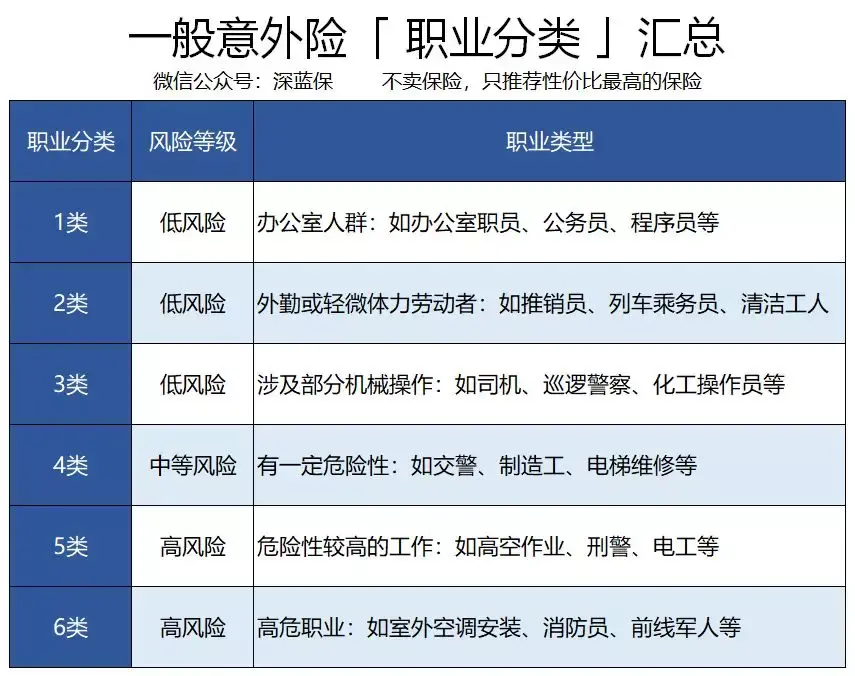 一般来说,意外险将职业划分为 1 - 6 类: