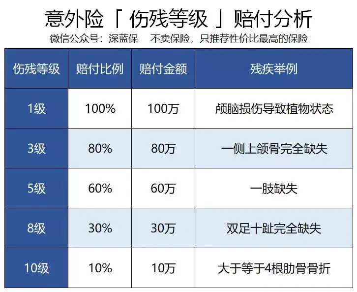 如果是最严重的 1 级伤残赔 100% 保额,赔你100万;2级残疾,就赔90万,依次递减。