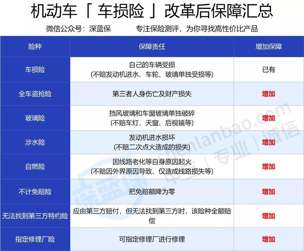 改革后,原来需要另外购买的全车盗抢险、玻璃险、涉水险等7 项附加险,都加入到车损险里面。具体如下: