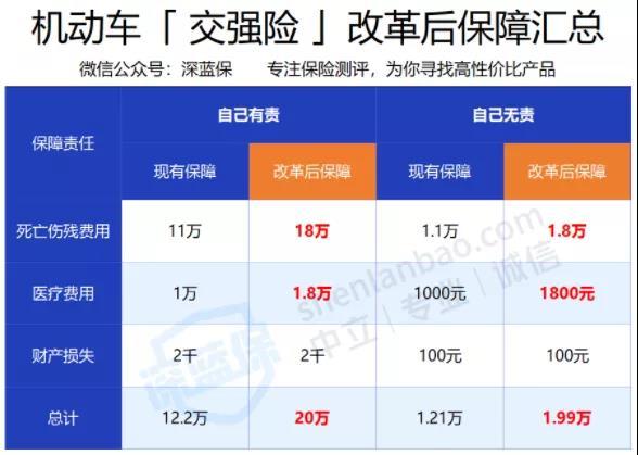 改革前,如果由于自己的责任造成对方死亡,最高也只赔 11 万,而改革后可赔 18 万。如果造成对方受伤,医疗费最多赔 1.8 万,比原来多了 8 千。