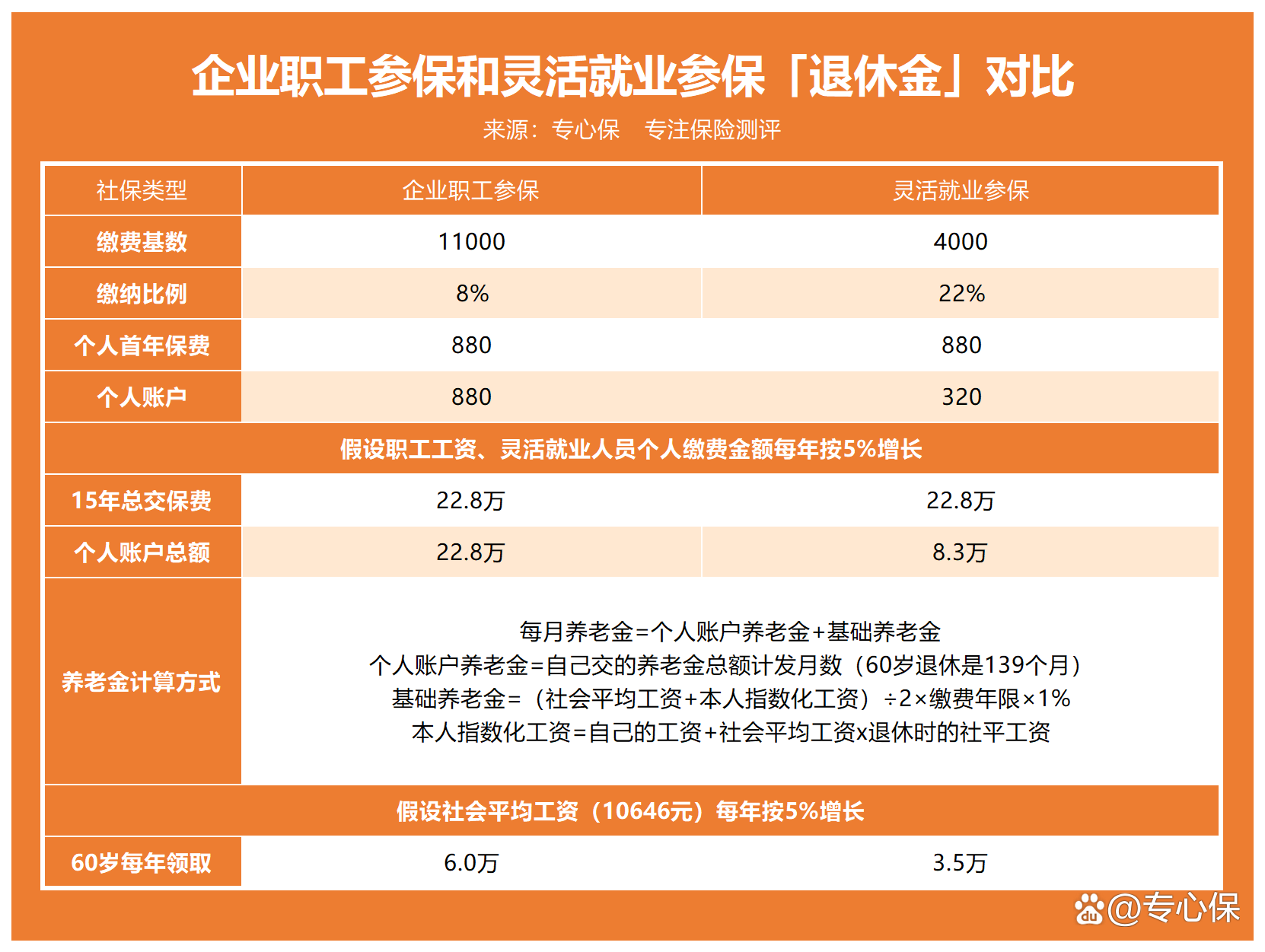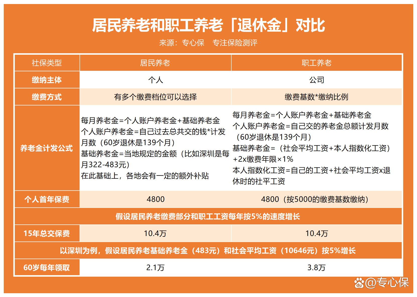 前段时间,个人养老金制度出炉了,养老话题再次炒得沸沸扬扬~ 从知乎这些热门问题上,就能看出当代年轻人是非常关心养老问题,甚至已经开始为养老做准备了。 所以,我今天就来跟大家聊聊养老保险的话题。 目前,我国的养老保障体系,分为三大支柱: 其中,政府的社保养老覆盖超过10亿人,是老百姓主要的养老金来源。 虽然退休之后能领到社保养老金,但是它也只能够提供基础的生活保障。 根据人社部公布的数据显示,2021年企业退休人员,每月人均养老金为2987元;而城乡居民每月人均养老金,仅有179元。 另一方面,随着这些年人口老龄化加剧、生育率持续走低,领养老金的老年人越来越多,交养老保险的年轻人却越来越少,未来社保养老金的支付压力也会加大。 如果我们把社保养老金比作水池,老年人越多,池子流出的水就越大。 种种迹象都表明,等我们这代人退休后,仅仅只靠社保养老金,肯定是不够花的。 那作为第二支柱的企业年金、职业年金,能否给我们的养老生活提供更多保障? 显然也比较困难!通常只有福利好的单位,比如央企、国企等,才会给员工买企业年金或职业年金,目前有这部分养老金补充的人,仅占全国人口的 4%,绝大多数人都没办法靠它养老。 “老大老二”靠不住,那就从第三支柱想想办法。 前段时间,国家发布的个人养老金制度,就属于第三支柱,靠个人的力量来补充养老。 养老个人养老金制度其实就是,国家以账户制为基础,建立一个官方管理的单独账户,用于存放大家缴纳的养老金,这部分钱会用于市场投资,进行养老金增值。 说白了,还是要自己攒钱养老,就有朋友问了,“个人养老金,和我们自己理财有啥区别?” 目前来看,区别并不多,区别并不大,虽然金融产品池子是由国家筛选过的,可能相对稳健一些,但买里面的银行理财照样不保本,基金一样有涨有跌,赚了亏了也都是自己承担。 不过,毕竟国家带着我们投资,总比理财小白瞎买强一点,后面如果产品不错,也可以考虑买,一年还能省点税钱,也是不错的。 对于这种模式,目前规模较小,目前人们对其认知有限,尚处于发展初期。 了解完目前我国目前养老现状,我再来说说养老保险的类型。 提到养老保险,大致上有三类,除了我们平常所熟知的职工养老保险、居民养老保险,还有商业养老保险。 居民养老保险和职工养老保险都是由我国养老保险体制的一部分,而商业养老保险则是由保险公司推出的,个人为了保障退休后养老生活质量而自愿购买的保险产品。 1、职工养老保险 先说职工养老保险,就是上班族缴的养老保险,包含在五险之中。 每个月从我们工资里扣8%进入个人账户(未来发放给个人),13%~16%由公司帮我们缴纳,进入统筹账户(支付当前退休者)。 另外,没有工作的人也可以灵活就业的身份去交职工养老,但要自己承担全部费用。 职工养老保险每个月都要交,需要累计缴满15年,这样到了退休年龄后才能领取养老金。 如果到了退休年龄,职工养老还没有缴满15年,那是无法一次性补缴的,但可以延长缴费,缴满年限后就可以领养老金了。 2、居民养老保险 然后,就是居民养老,像家里老人很多交的就是这种,一般分为多个缴费档次,各地一般分为12个甚至更多档位,不同地区规定有所不同,不同档次政府能给到的财政补贴不一样。 一般来说,最低档位每年只需要缴纳几百块,最高档次每年需要缴纳几千块不等。 同样地,居民养老保险也需要累计缴费满15年,那么60岁就可以办理手续领取养老金。 如果60岁时累计年限不够15年,那么大部分地区通常都可以一次性补缴至15年。 总的来说,居民养老虽然缴费少,但发放的养老金也低;而职工养老虽然交得多,但以后能领更多养老金。 3、商业养老保险 商业养老保险本质上是一种理财类型的保险,大多指年金险和增额终身寿险。 但无论是哪类保险,在购买前我们都可以明确知道这款产品的具体收益。 如年金险,在购买前你可以通过产品界面明确知道什么时候能领钱,能领多少钱,能领多久,并且这些都是会明确写进保险合同内的,受到《合同法》保护。 而增额终身寿险我们可以通过产品的现金价值表看到,每一年产品的现金价值是多少,而现金价值就代表着我们能拿到手的钱。 所以,一旦签订合同,则直接锁定收益,无论市场环境如何变化,我们该领到钱,一分都不会少。 那么,我们个人购买养老保险,应该怎么选择呢?怎么买才最划算? 这个问题,我们要分开来看, 首先,我们对比一下职工养老和居民养老, 1、职工养老VS居民养老 居民养老保险缴费从几百块到几千块都有,有多个档次可以选择,很灵活;一般是一年交一次钱。 而单位交的职工养老呢,是公司和个人共同缴纳,每个月交的钱等于缴费基数乘以缴纳比例。 缴费基数有上下限,一般是当地平均工资的60%—300%。 假如你的工资正好在范围内,就按真实的工资来交;如果超过这个范围就按上限来算,低于就按下限。 缴纳比例就更简单了,公司交的各地规定都不同,而个人是统一缴纳8%。 这两种保险,养老金的计发公式是完全不同的: 以深圳为例,假如居民和职工每年都交一样的钱, 而且个人缴费金额和居民养老的基础养老金、当地社平工资每年都按5%的水平增长, 十五年退休后,居民养老一年可以领2万多,而职工养老呢差不多可以领到4万。 可以看到,这两种待遇相差还是比较大的! 这点不难理解,毕竟居民养老领的基