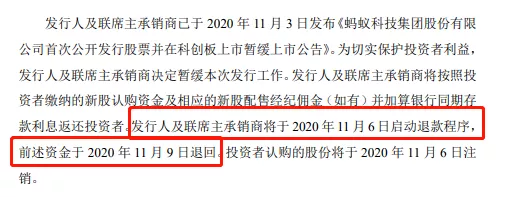 虽然蚂蚁没能上市,但于 11 月 5 日晚间发布公告,启动新股认购资金的退款程序。
