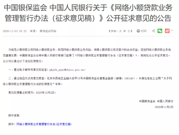 这里指的是由银保监会和央行联合发布的《网络小额贷款业务管理暂行办法(征求意见稿)》。