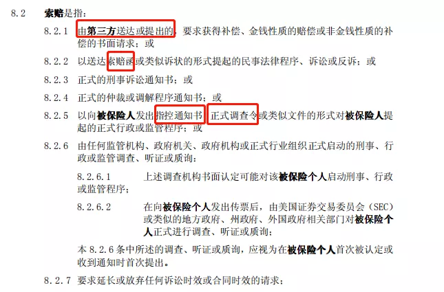 条款里有很多耐人寻味的词,比如第三方赔偿请求、正式的索赔函、指控通知书或者正式调查令等等。